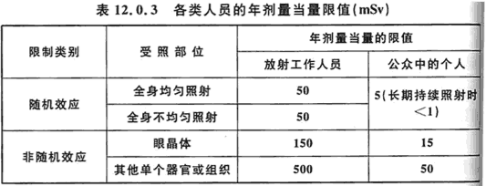 12.0.3 電離輻射防護(hù)設(shè)計(jì)時(shí),各類人員的年劑量當(dāng)量限值應(yīng)符合表12.0.3的規(guī)定。