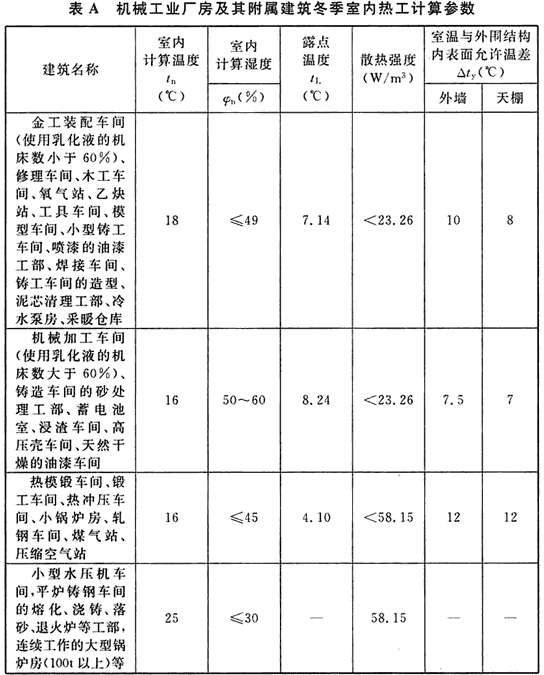 附錄A 機(jī)械工業(yè)廠房及其附屬建筑冬季室內(nèi)熱工計(jì)算參數(shù)