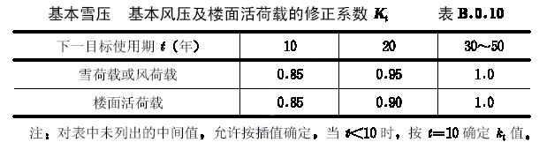 B.0.10 當(dāng)對(duì)本附錄B.0.1規(guī)定的各種情況進(jìn)行加固設(shè)計(jì)驗(yàn)算時(shí),其基本雪壓值、基本風(fēng)壓值和樓面活荷載的標(biāo)準(zhǔn)值,除應(yīng)按現(xiàn)行荷載規(guī)范的規(guī)定采用外,尚應(yīng)按下一目標(biāo)使用期,乘以本附錄表B.0.10的修正系數(shù)kt予以修正。