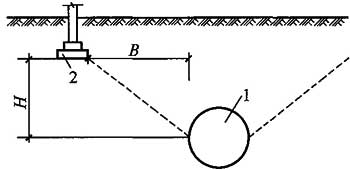 H.0.2 地下隧道工程施工對(duì)建筑安全影響的區(qū)域,可根據(jù)地下隧道側(cè)邊距建筑基礎(chǔ)底面?zhèn)冗叺淖罱骄嚯xB與地下隧道水平中心線距建筑基礎(chǔ)底面垂直距離H的比值劃分為兩類(lèi):Ⅰ類(lèi)影響區(qū)的B/H>1;Ⅱ類(lèi)影響區(qū)的B/H≤1(圖H.0.2-1、圖H.0.2-2)。
