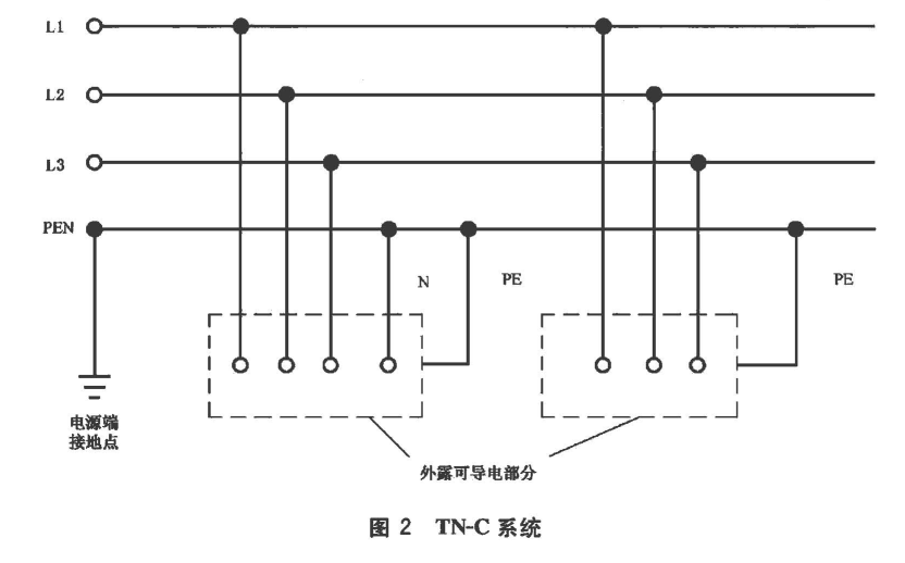 b) TN-C系統(tǒng):整個(gè)系統(tǒng)的中性導(dǎo)體和保護(hù)導(dǎo)體是合一的(見圖2)。