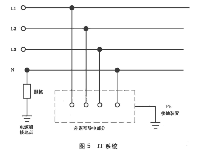 電源端的帶電部分不接地或有一點(diǎn)通過阻抗接地,電氣裝置的外露可導(dǎo)電部分直接接地(見圖5)。