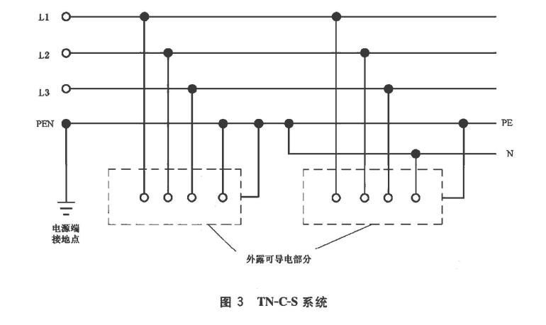 c) TN-C-S系統(tǒng):系統(tǒng)中一部分線路的中性導(dǎo)體和保護(hù)導(dǎo)體是合一的(見圖3)。