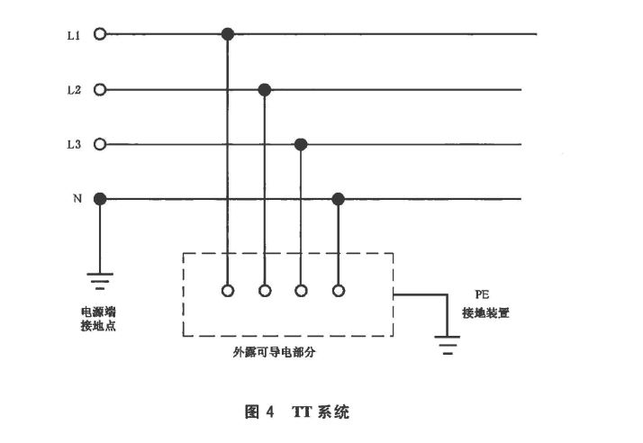 電源端有一點(diǎn)直接接地,電氣裝置的外露可導(dǎo)電部分直接接地,此接地點(diǎn)在電氣上獨(dú)立于電源端的接地點(diǎn)(見圖4)。