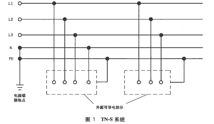 a) TN-S系統(tǒng):整個(gè)系統(tǒng)的中性導(dǎo)體和保護(hù)導(dǎo)體是分開的(見圖1)。