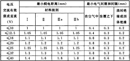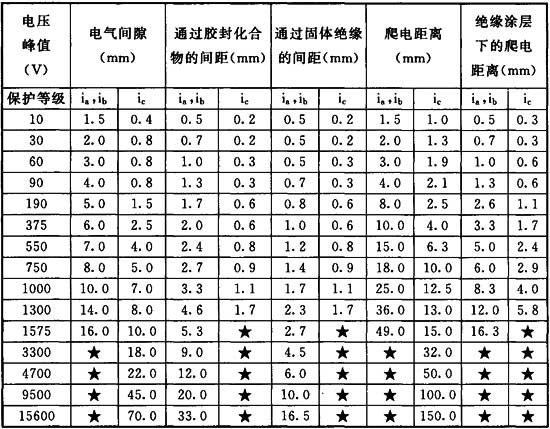 注:1 在確定爬電距離和電氣間隙要求的值時,為了認(rèn)可常用額定電壓范圍,表中的電壓值可增加至表列數(shù)值的1.1倍;