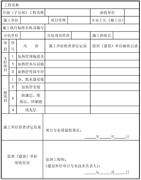 表F.0.6 加熱管安裝工程質(zhì)量檢驗(yàn)表