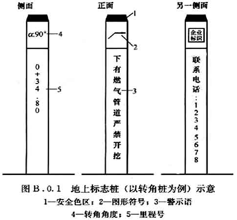 3.0.3 專用標(biāo)志應(yīng)能明確表達(dá)燃?xì)庠O(shè)施特有的信息,可包含圖形符號、文字和管道定位裝置等。專用標(biāo)志可分為燃?xì)廨斉涔芫€標(biāo)志、燃?xì)庠O(shè)施名稱標(biāo)志和燃?xì)鈴S站內(nèi)地上工藝管道標(biāo)志3種類型。