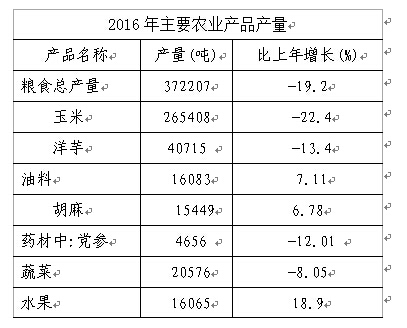 二、農(nóng)業(yè)全年全縣農(nóng)作物播種面積189.53萬畝,比上年下降0.01%,其中糧食作物播種面積161.32萬畝,比上年下降1.41%。糧食總產(chǎn)量達(dá)到372207噸,下降19.2%。其中,夏糧56491.1噸,下降7.49%;秋糧315715.9噸,下降20.98%。全年糧食單產(chǎn)230.7公斤,下降18.04%;油料種植面積12.81萬畝,增長16.99%,油料產(chǎn)量16083噸,增長7.11%。主要農(nóng)產(chǎn)品產(chǎn)量如表。