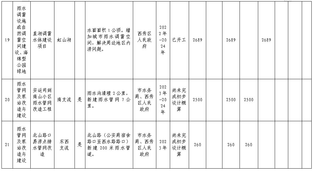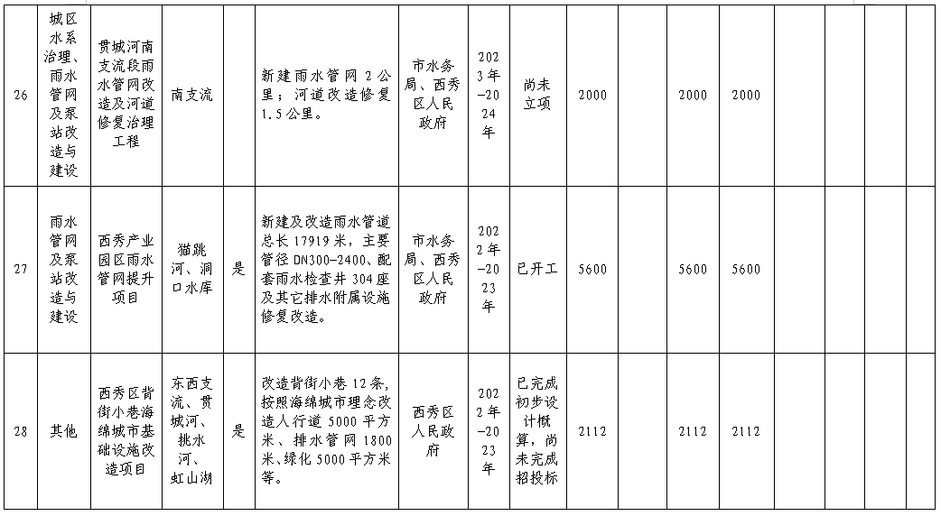 2.提升排水管網(wǎng)能力。加強(qiáng)排水系統(tǒng)建設(shè),提升管網(wǎng)排水能力,補(bǔ)齊排水設(shè)施短板,提升城市內(nèi)澇防治水平。重點(diǎn)實(shí)施城市建成區(qū)老城、雙陽、小屯河、西秀產(chǎn)業(yè)園等9項(xiàng)雨水管網(wǎng)提標(biāo)工程。