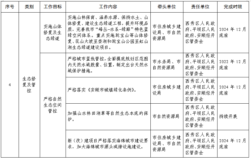 2.嚴(yán)格自然生態(tài)空間管控。嚴(yán)格城市藍(lán)線管控,全面摸清規(guī)劃區(qū)范圍內(nèi)天然水域數(shù)量、空間位置,制定出臺天然水域保護(hù)措施。在城市規(guī)劃建設(shè)過程中,原則上不得侵占天然水域。嚴(yán)格落實(shí)《安順市城鎮(zhèn)綠化條例》,加強(qiáng)山水林田湖草等自然生態(tài)本底的保護(hù),新(改)建項(xiàng)目嚴(yán)格落實(shí)海綿城市建設(shè)要求,加大海綿城市源頭減排設(shè)施建設(shè)。