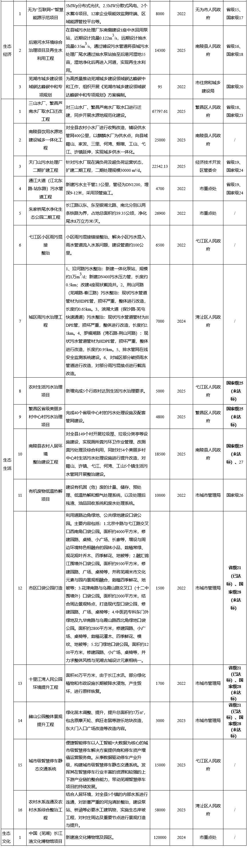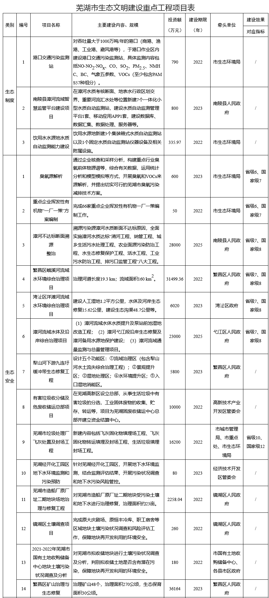 蕪湖市生態(tài)文明建設(shè)重點工程主要分為生態(tài)制度建設(shè)工程、生態(tài)安全建設(shè)工程、生態(tài)空間保護(hù)工程、生態(tài)經(jīng)濟(jì)建設(shè)工程、生態(tài)生活建設(shè)工程、生態(tài)文化建設(shè)工程等六個方面,共設(shè)置重點項目38項,總投資約59.57億元;各項目具體建設(shè)內(nèi)容、投資情況見表3;蕪湖市生態(tài)文明建設(shè)重點工程主要分為生態(tài)制度建設(shè)工程、生態(tài)安全建設(shè)工程、生態(tài)空間保護(hù)工程、生態(tài)經(jīng)濟(jì)建設(shè)工程、生態(tài)生活建設(shè)工程、生態(tài)文化建設(shè)工程等六個方面,工程項目明細(xì)見附件。