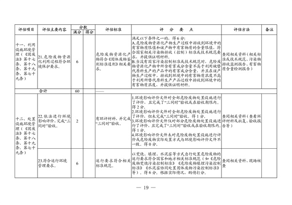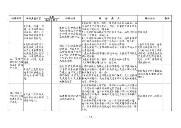 (三)評(píng)估安排。省廳將于文件印發(fā)之日起,分階段分區(qū)域組織開展省級(jí)現(xiàn)場(chǎng)評(píng)估。各地級(jí)以上市生態(tài)環(huán)境局應(yīng)于2023年1月10日前按照《評(píng)估指標(biāo)》表1進(jìn)行自評(píng)打分(附佐證材料),總結(jié)2022年度危險(xiǎn)廢物規(guī)范化環(huán)境管理工作情況(要求見(jiàn)附件3),一并報(bào)送省廳。