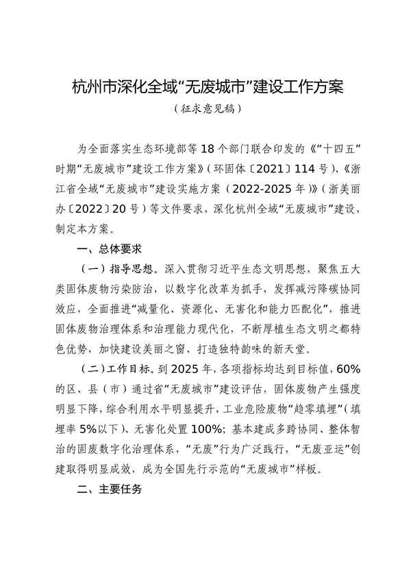 關(guān)于公開征求《杭州市深化全域“無廢城市”建設(shè) 工作方案》意見的公告