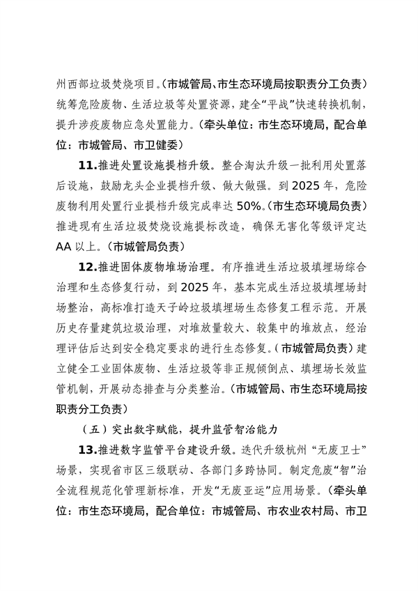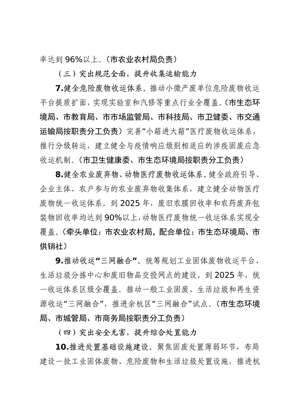 杭州市生態(tài)環(huán)境局印發(fā)關(guān)于公開征求《杭州市深化全域“無廢城市”建設(shè) 工作方案》意見的公告,目標到2025年,各項指標均達到目標值,60%的區(qū)、縣(市)通過省“無廢城市”建設(shè)評估,固體廢物產(chǎn)生強度下降,綜合利用水平明顯提升,工業(yè)危險廢物“趨零填埋”(填埋率5%以下)、無害化處置100%;基本建成多跨協(xié)同、整體智治的固廢數(shù)字化治理體系,“無廢”行為廣泛踐行,“無廢亞運”創(chuàng)建取得明顯成效,成為全國先行示范的“無廢城市”樣板。