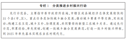 堅持戰(zhàn)略思維,統(tǒng)籌鞏固脫貧攻堅成果和鄉(xiāng)村振興兩大任務,堅持分類指導精準施策。分類推進鄉(xiāng)村振興,實施“萬企興萬村”行動。把全省117個縣(市、區(qū))劃分為先行示范縣、整體推進縣、重點幫扶縣三類,統(tǒng)籌政策投入和考核,分類指導推進。先行示范縣重點加快城鄉(xiāng)融合發(fā)展,打造鄉(xiāng)村振興樣板。整體推進縣重點加快產業(yè)融合發(fā)展,穩(wěn)步推進鄉(xiāng)村振興,加快農業(yè)農村現代化。重點幫扶縣重點加快產業(yè)就業(yè)融合,持續(xù)鞏固脫貧攻堅成果,實現平穩(wěn)過渡、有效銜接。建立普惠與特惠相結合的政策支持體系,對“三類縣”實施分類考核。