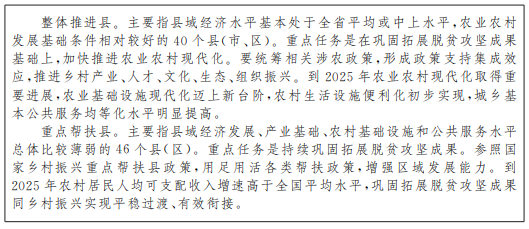 到2025年,圍繞共同富裕,聚焦農業(yè)“特”“優(yōu)”戰(zhàn)略,全面推進鄉(xiāng)村振興,農業(yè)農村現代化取得重要進展。第一產業(yè)增加值、農產品加工業(yè)總產值、十大產業(yè)集群產值實現“三個翻番”,農村居民人均可支配收入增速、脫貧地區(qū)農村居民人均可支配收入增速力爭達到或高于全國平均水平。梯次推進有條件的地區(qū)率先基本實現農業(yè)農村現代化。脫貧地區(qū)實現鞏固拓展脫貧攻堅成果同鄉(xiāng)村振興有效銜接。