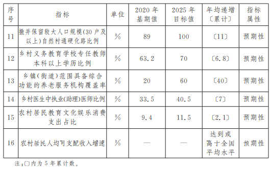——農民富裕富足達到新水平。鄉(xiāng)村治理現代化水平不斷提高,鄉(xiāng)村文明程度持續(xù)提升,農村發(fā)展安全保障更加有力。城鄉(xiāng)要素平等交換、雙向流動,農村一二三產業(yè)融合發(fā)展機制基本形成,農業(yè)農村發(fā)展活力明顯增強。脫貧攻堅政策體系和工作機制同鄉(xiāng)村振興有效銜接,脫貧攻堅成果鞏固拓展,防止返貧動態(tài)監(jiān)測和幫扶機制健全完善,確保不發(fā)生規(guī)模性返貧。農民科技文化素質和就業(yè)技能進一步提升,農民增收渠道有效拓寬,城鄉(xiāng)居民收入差距進一步縮小。