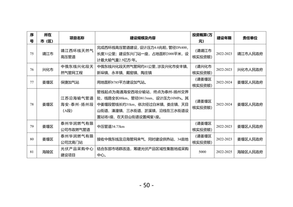 促進(jìn)常規(guī)天然氣增產(chǎn),依托江蘇首個(gè)干熱巖勘查驗(yàn)證孔興化“蘇熱1井”孔址,推動(dòng)中深層地?zé)豳Y源開(kāi)發(fā)利用示范工程合理開(kāi)發(fā)建設(shè)。堅(jiān)持“多種氣源,多種途徑”,依托西氣東輸現(xiàn)有管道氣供應(yīng)市場(chǎng),重點(diǎn)推進(jìn)戴南門(mén)站—泰興門(mén)站、俄氣興化門(mén)站—安豐站等供氣管網(wǎng)建設(shè)項(xiàng)目。推進(jìn)溱潼凹陷頁(yè)巖油氣勘探開(kāi)發(fā)示范區(qū)建設(shè),加強(qiáng)與中石油、中石化、中海油等上游天然氣資源企業(yè)的溝通,推動(dòng)天然氣儲(chǔ)氣調(diào)峰設(shè)施與城市管網(wǎng)、燃?xì)怆姀S等有效銜接。按需新增國(guó)家管網(wǎng)、省級(jí)管網(wǎng)分輸端口,增建天然氣門(mén)站設(shè)施,初步形成調(diào)度靈活、自主可控的天然氣輸運(yùn)體系。完善輸儲(chǔ)設(shè)施協(xié)同發(fā)展,推進(jìn)泰興LNG接收站建設(shè),切實(shí)增強(qiáng)LNG應(yīng)急儲(chǔ)備能力,保障天然氣安全供應(yīng)。大力推進(jìn)天然氣熱電冷聯(lián)供的供能方式,推進(jìn)分布式可再生能源發(fā)展,推行終端用能領(lǐng)域多能協(xié)同和能源綜合梯級(jí)利用。