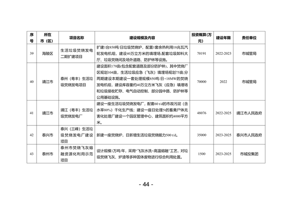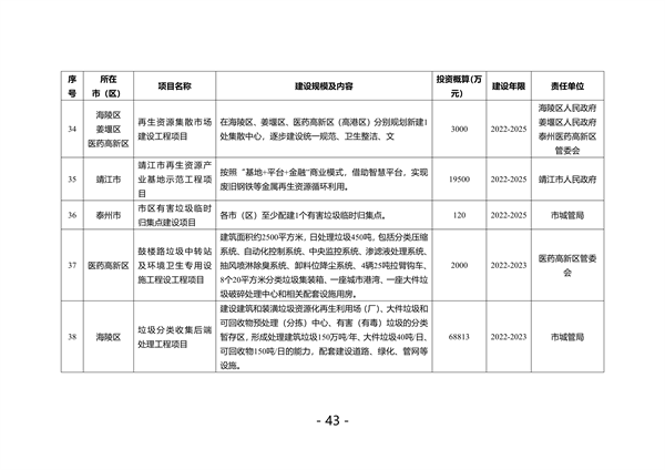 全市統(tǒng)籌布局“1+3X”垃圾分類后端處置項(xiàng)目,重點(diǎn)建設(shè)1個(gè)資源循環(huán)利用基地(生態(tài)保障園),抓緊推進(jìn)泰州(粵豐)生活垃圾焚燒發(fā)電項(xiàng)目、泰州(湘環(huán)城投)垃圾分類收集后端處置項(xiàng)目、泰州(藍(lán)德)餐廚廢棄物處理項(xiàng)目改擴(kuò)建工程,完善垃圾焚燒飛灰處理等配套設(shè)施;靖江市、泰興市、興化市根據(jù)各自垃圾產(chǎn)生量和處置能力現(xiàn)狀,科學(xué)規(guī)劃、合理布局垃圾焚燒、餐廚廢棄物處理、建筑垃圾處置項(xiàng)目,全面提高垃圾處置能力。到2025年,全市生活垃圾焚燒處理能力達(dá)4800噸/日,餐廚廢棄物(廚余垃圾)處理能力達(dá)到970噸/日,建筑垃圾處置能力達(dá)到168萬(wàn)噸/年,基本形成無(wú)害化處理、資源化利用等多種技術(shù)并存的格局,實(shí)現(xiàn)原生垃圾零填埋、城鄉(xiāng)生活垃圾無(wú)害化處理率保持100%,垃圾焚燒飛灰處理能力全面滿足需要。