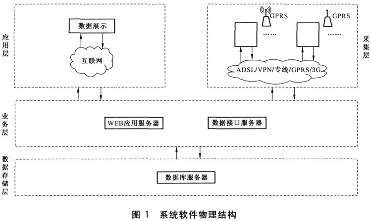 系統(tǒng)軟件物理結(jié)構(gòu)參見(jiàn)圖1。監(jiān)測(cè)終端采集數(shù)據(jù),通過(guò)網(wǎng)絡(luò)傳輸給數(shù)據(jù)接口服務(wù)器,經(jīng)過(guò)系統(tǒng)處理存入系統(tǒng)數(shù)據(jù)庫(kù)中,再由WEB應(yīng)用服務(wù)器進(jìn)行顯示。