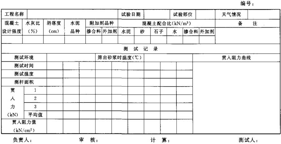 2 繪制混凝土貫入阻力曲線,以貫入阻力為縱坐標(biāo)(kN/cm2),以混凝土齡期(h)為橫坐標(biāo),繪制曲線的試驗(yàn)數(shù)據(jù)不得少于6個(gè)。