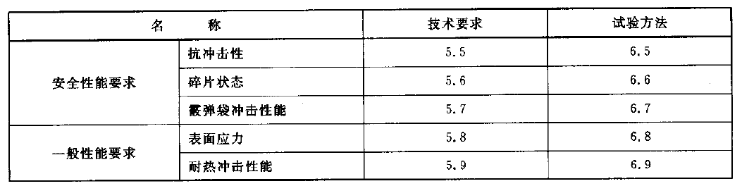 5.0 鋼化玻璃的各項(xiàng)性能及其試驗(yàn)方法應(yīng)符合表1相應(yīng)條款的規(guī)定。其中安全性能要求為強(qiáng)制性要求。