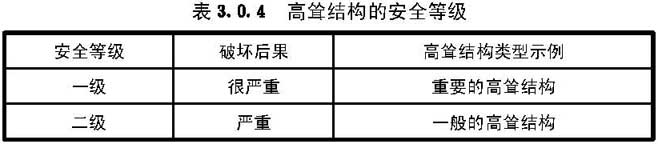 3.0.4 高聳結(jié)構(gòu)設(shè)計時,應(yīng)根據(jù)結(jié)構(gòu)破壞可能產(chǎn)生的后果(危及人的生命、造成經(jīng)濟(jì)損失、產(chǎn)生社會影響等)的嚴(yán)重性,采用不同的安全等級。高聳結(jié)構(gòu)安全等級的劃分應(yīng)符合表3.0.4的要求。
