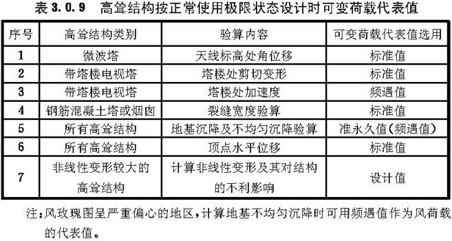 3.0.9 高聳結(jié)構(gòu)按正常使用極限狀態(tài)設(shè)計時可變荷載代表值可按表3.0.9選取: