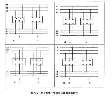 d) 如果一臺變壓器的相序與另一臺剛好相反,則組3中的變壓器與組4中的變壓器并聯運行,如圖C.2;