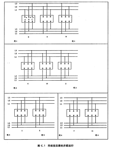c) 在實際平衡負載條件下,屬于同組的兩臺變壓器可并聯運行,如圖C.1;