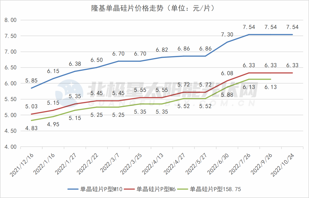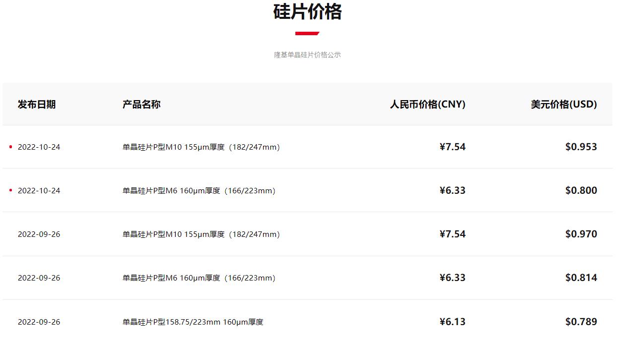 10月24日,隆基發(fā)布最新單晶硅片價格公示,與上次(9月26日)報價相比,M10、M6硅片價格未變,分別為7.54元/片、6.33元/片;G1單晶硅片報價取消,該規(guī)格上次報價為6.13元/片。