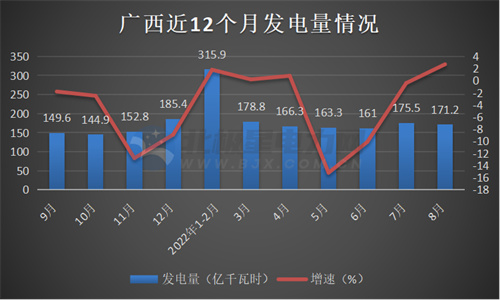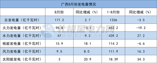 1-8月,總發(fā)電量1336億千瓦時(shí),同比減少3.5%;其中,火電發(fā)電量652.2億千瓦時(shí),同比減少19.2%;水力發(fā)電量439.2億千瓦時(shí),同比增長(zhǎng)27.2%;風(fēng)力發(fā)電量111.9億千瓦時(shí),同比增長(zhǎng)16.3%;太陽(yáng)能發(fā)電量18.39億千瓦時(shí),同比增長(zhǎng)34.3%;核電發(fā)電量15.9億千瓦時(shí),同比增長(zhǎng)18.1%。