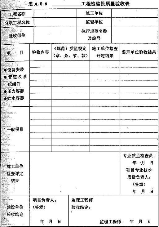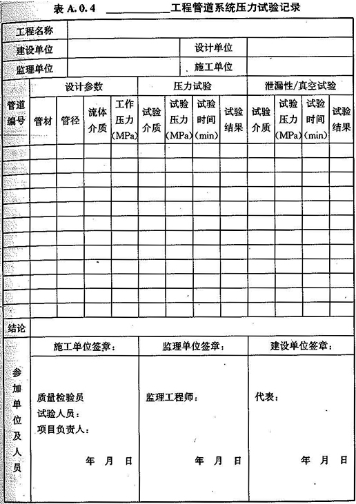 A. 0. 4 管道系統(tǒng)壓力試驗(yàn)應(yīng)由監(jiān)理單位組織施工單位、建設(shè)單位進(jìn)行驗(yàn)收,施工單位應(yīng)按表A. 0. 4的格式填寫驗(yàn)收記錄,并由監(jiān)理單位填寫驗(yàn)收結(jié)論意見。