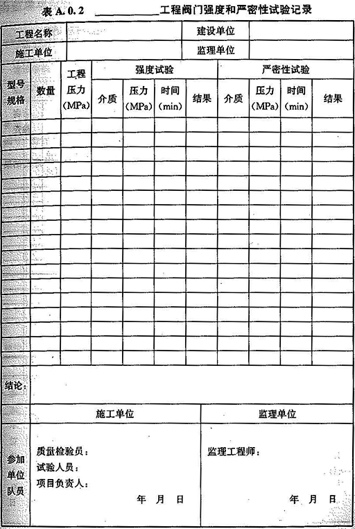 A. 0. 2 閥門強(qiáng)度和嚴(yán)密性的試驗(yàn)應(yīng)由施工單位組織監(jiān)理工程師進(jìn)行試驗(yàn),應(yīng)按表A. 0. 2的格式填寫記錄并得出結(jié)論。