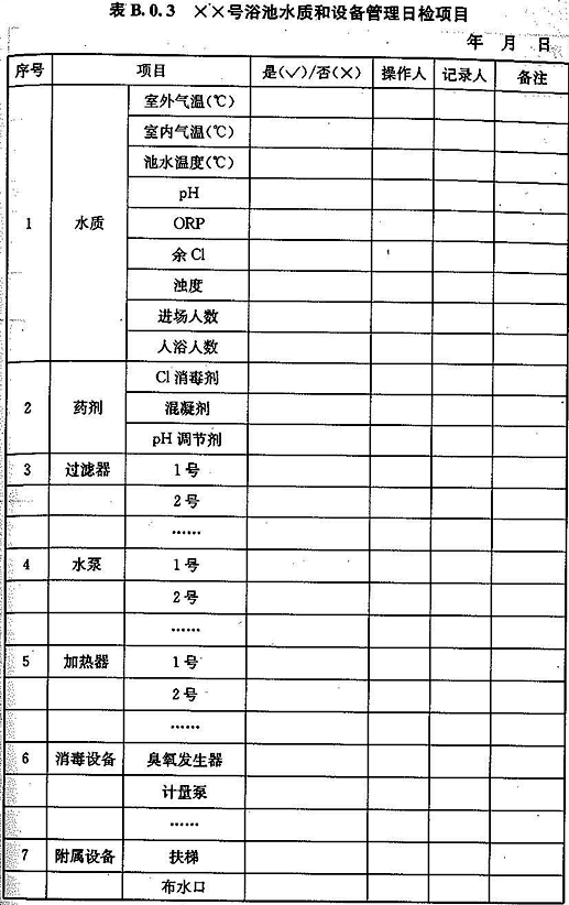 B.0.3 浴池水質(zhì)和設(shè)備每日管理記錄的內(nèi)容及格式應(yīng)符合表B.0. 3的規(guī)定。