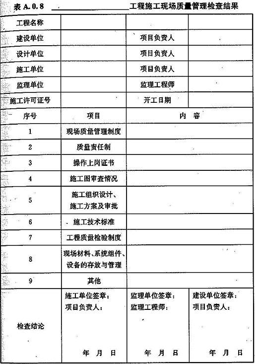 A. 0.8 施工現(xiàn)場(chǎng)質(zhì)量管理檢查記錄應(yīng)由施工單位按表A. 0.8的格式填寫,監(jiān)理工程師和建設(shè)單位的項(xiàng)目負(fù)責(zé)人應(yīng)進(jìn)行檢查,并作出檢查結(jié)論。