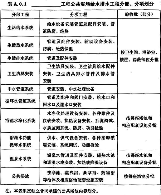 A. 0.1 公共浴場(chǎng)單位工程、分部工程、分項(xiàng)工程應(yīng)按表A.0. 1的規(guī)定劃分。