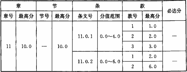注:本標(biāo)準(zhǔn)參評(píng)的條文數(shù)共計(jì)116條,第4章至第10章最高分為100分,第11章最高附加分10分。