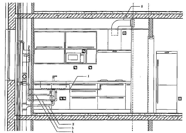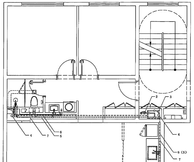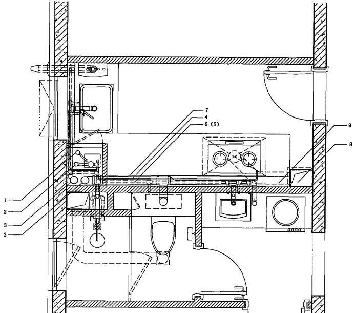 3——排水立管; 4——燃?xì)馑焦埽?br/>5——熱水水平管; 6——冷水水平管;