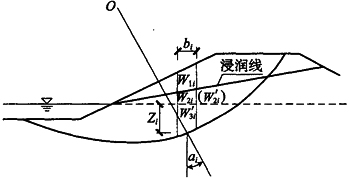 W1i、W2i、W′2i、W′3i——第i個土條浸潤線以上的土體的天然重量、浸潤線與外坡水位線之間的土體的飽和重量、浸潤線與外坡水位線之間的土體的浮重量、外坡水位線以下的土體浮重量(kN);