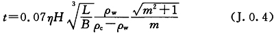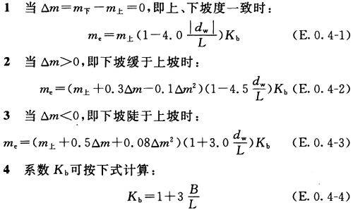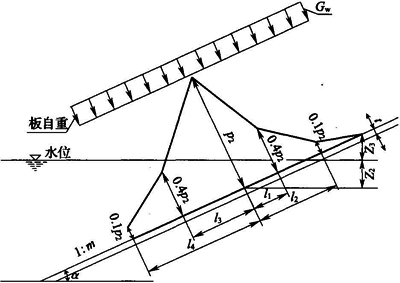 K.0.2 當(dāng)海堤護(hù)坡自身結(jié)構(gòu)不緊密或埋置較深不易發(fā)生整體滑動時,應(yīng)計(jì)算護(hù)坡內(nèi)部穩(wěn)定。一般不穩(wěn)定破壞發(fā)生在低潮水位期。護(hù)坡體和岸坡是兩種不同抗剪強(qiáng)度的材料,水位較低時,往往沿抗剪強(qiáng)度較低的接觸面向下滑動,滑動計(jì)算簡圖見圖K.0.2,假定滑動面經(jīng)過坡前水位和坡岸滑裂面的交點(diǎn),全滑動面為abe折線。折點(diǎn)b以上護(hù)坡體產(chǎn)生滑動力。依靠下部護(hù)坡體的內(nèi)部摩阻力平衡。