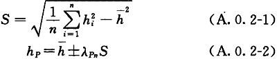 1 對n年連續(xù)的年最高或最低潮(水)位序列h i,其均值 h可按式(A.0.1-1)計(jì)算,均方差S年頻率為P的年最高或最低潮(水)位可按下列公式計(jì)算確定,其中λ Pn是與頻率P及資料年數(shù)n有關(guān)的系數(shù),可按表A.0.2采用。