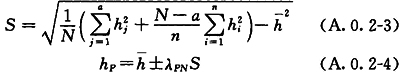 2 對在n年連續(xù)的年最高或最低潮(水)位序列hi外,根據(jù)調(diào)查,在考證期N年中有a個特高或特低潮(水)位值hj,其均值h可按式(A.0.1-4)計(jì)算確定,均方差S及年頻率為P的年最高或最低潮(水)位可按下列公式計(jì)算確定,其中λPN是與頻率P及考證期N有關(guān)的系數(shù),可按表A.0.2采用。