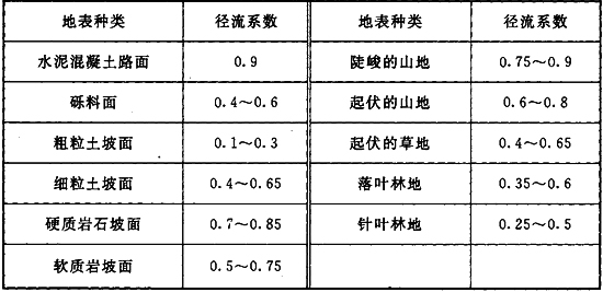 ψ——徑流系數(shù),見表L.0.2,周邊排水應(yīng)以不同的地表類型選取徑流系數(shù)按相應(yīng)面積大小取加權(quán)平均值;