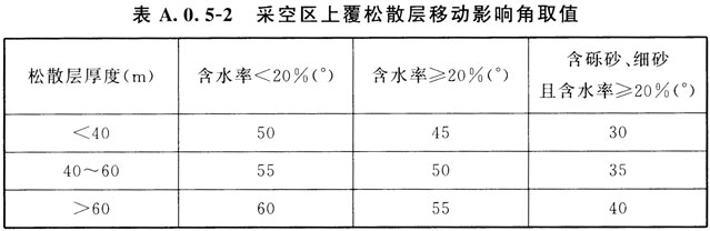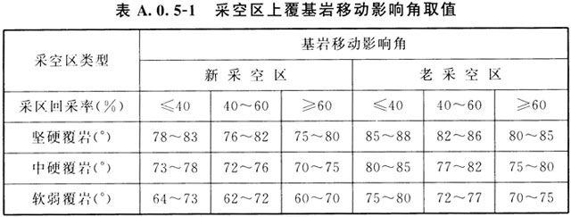 A.0.5 計算采空區(qū)地基處理范圍時,基巖移動角與松散層移動角的取值可按表A.0.5-1及表A.0.5-2取值。