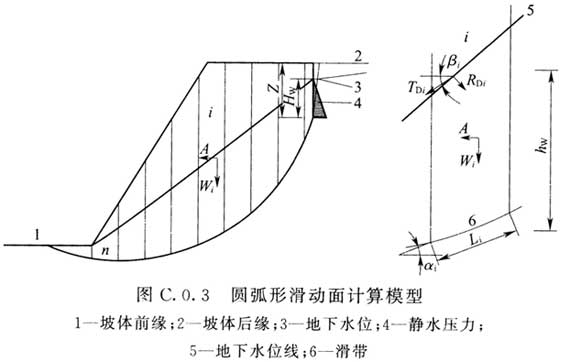 C.0.3 采動邊坡單一平面或圓弧形滑移穩(wěn)定性系數(shù)Kf可按下列公式計算(圖C.0.3)。
