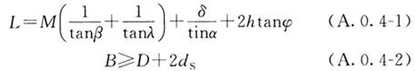 A.0.4 急傾斜煤層采空區(qū)治理范圍與煤層的走向垂直方向,采空區(qū)在傾向上治理區(qū)為危險移動邊界范圍(圖A.0.4-1),其沿煤層傾向治理長度L可按式(A.0.4-1)計算;橫向治理寬度B(圖A.0.4-2)計算可按式(A.0.4-2)計算。