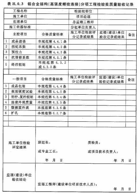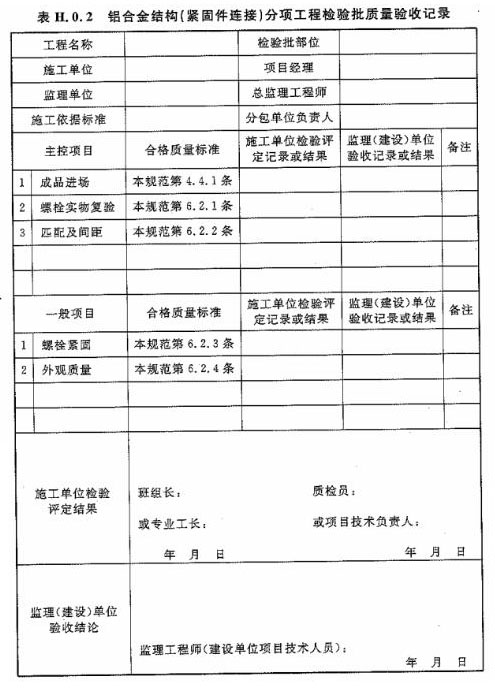 H.0.2 鋁合金結(jié)構(gòu)(緊固件連接)分項工程檢驗批質(zhì)量驗收應(yīng)按表H.0.2進行記錄。大牛工程師