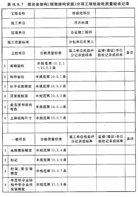 H.0.7 鋁合金結(jié)構(gòu)(框架結(jié)構(gòu)安裝)分項工程檢驗批質(zhì)量驗收應(yīng)按表H.0.7進行記錄。大牛工程師